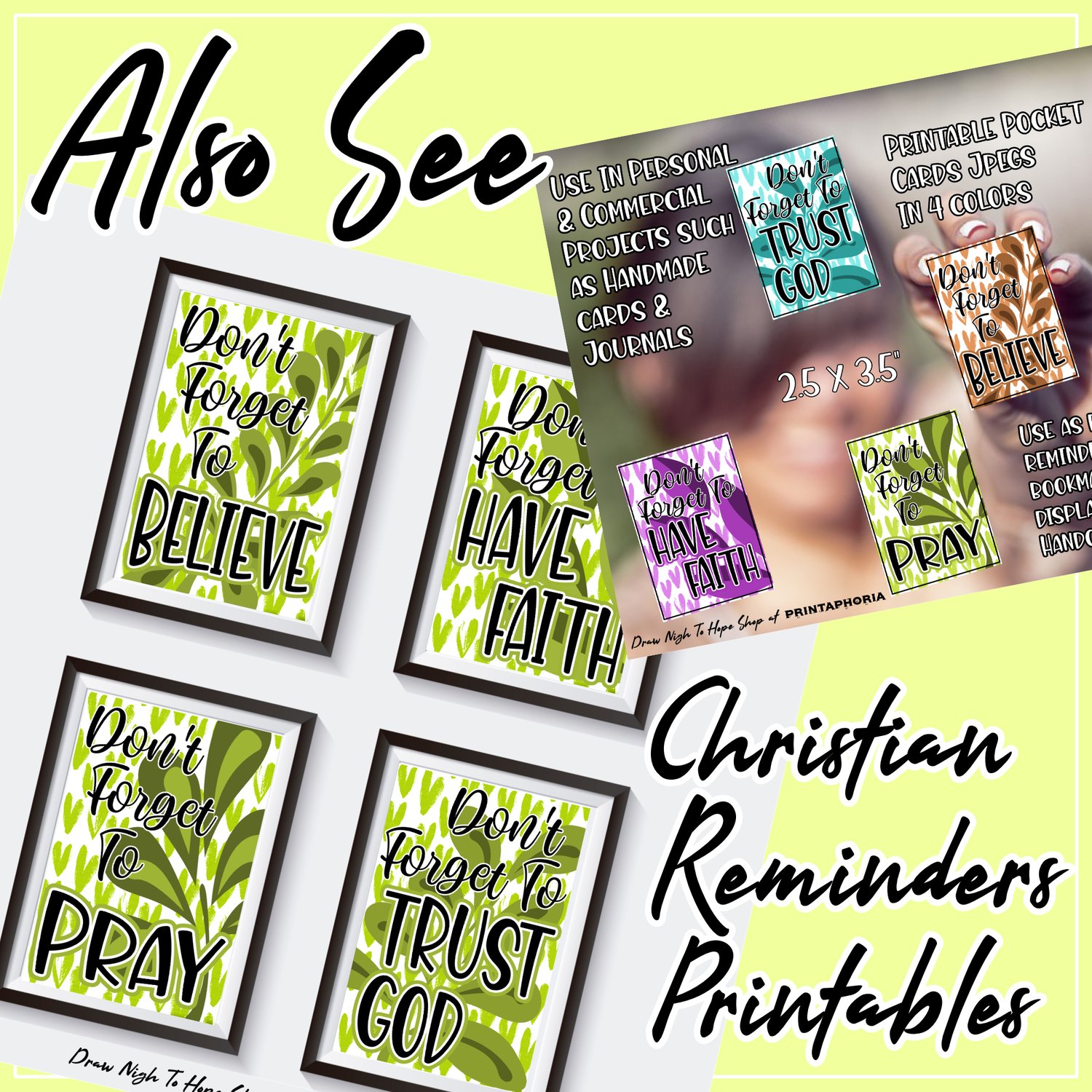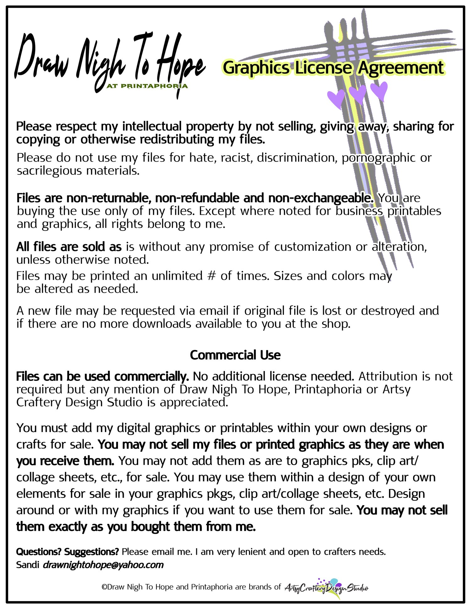 I have not given permission for other shops, websites, crafters or designers to sell my files or printed graphics. If you see my printables and digitals being sold other than through Draw Nigh To Hope Shop/blog, Printaphoria Shop/blog or Artsy Craftery Design Studio, it is possible that they have been stolen. Feel free to alert me and thank you!