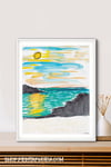 Sun On Water Painting, Paintings Of Rocks In The Sea, Serene Afternoon Sea Paintings, Sparkling Ocean Pictures, White Sand Beach Paintings, Big Rocks On The Beach, Black Rocks On Beach, Turquoise And Yellow